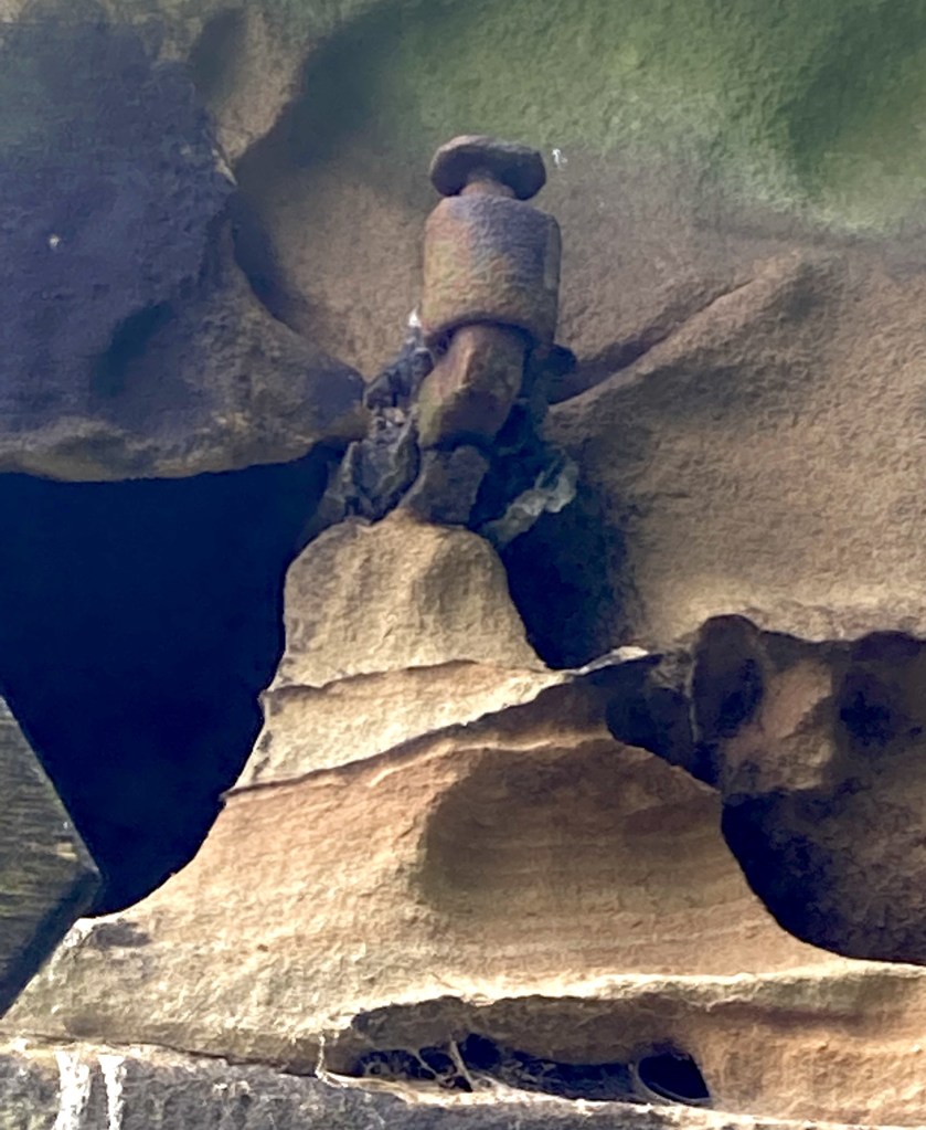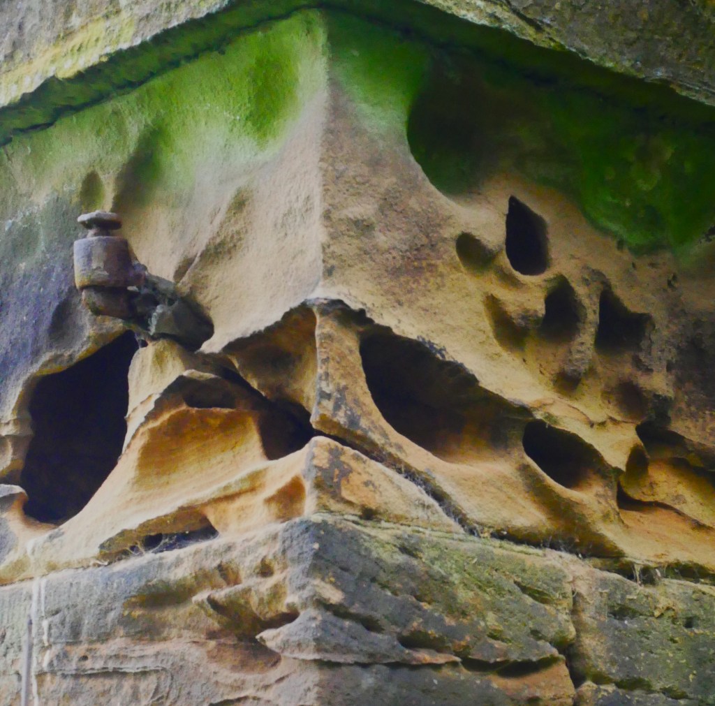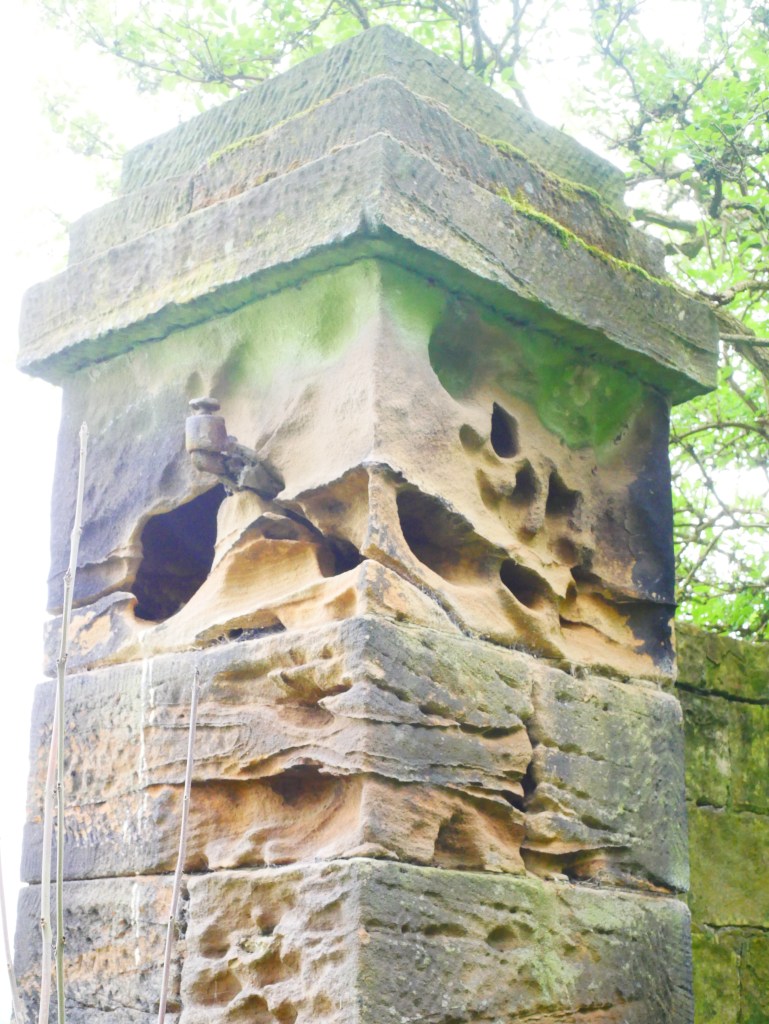 The stone has weathered differently to the rest of the wall around it and I wonder whether it is millstone grit rather than sandstone as this was frequently the material of choice for monuments and gate posts. I wonder, too whether it dates from a different time.  Whatever the history though, the erosion, particularly around the trauma to the stone of the fitting of the iron hinges, has all the mystery of a miniature cave system.