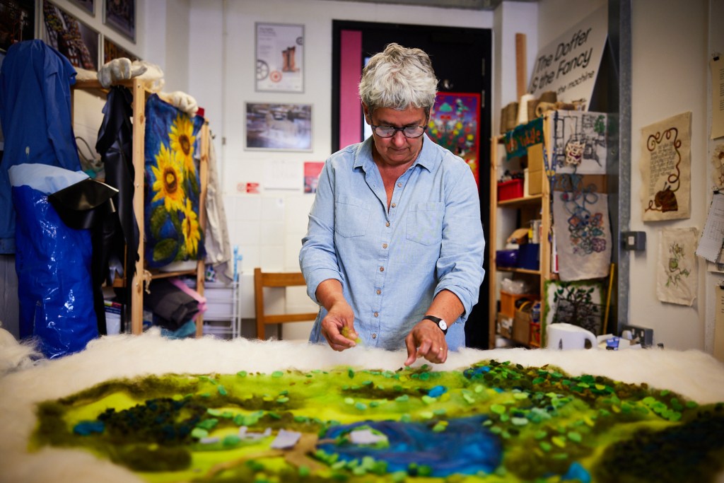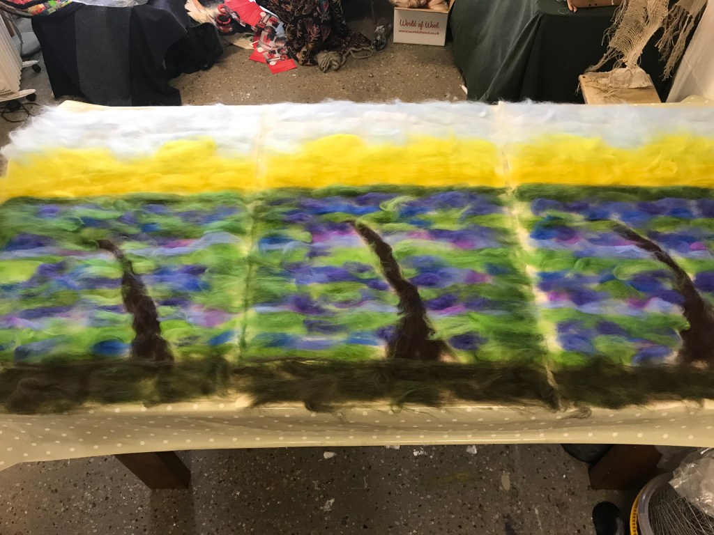 Wet felting a large piece like this comes with its own practical complications. To save me the backache of working on the studio floor, I had to create extensions to my already large felting table. The background wool is a mixture of merino and blue-faced Leicester fleece and silk.