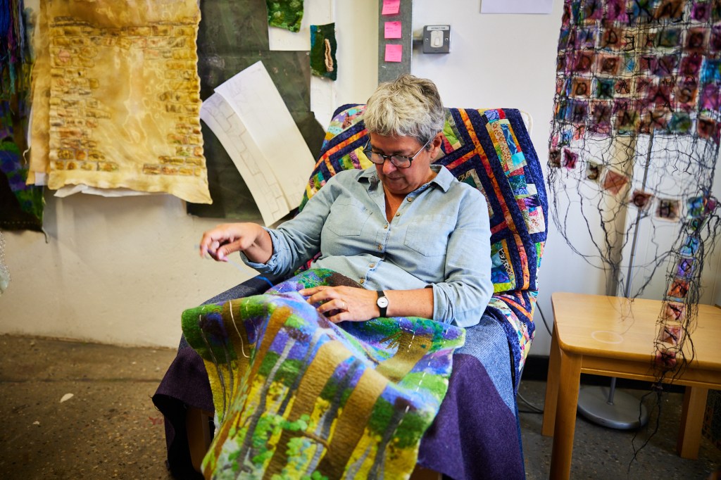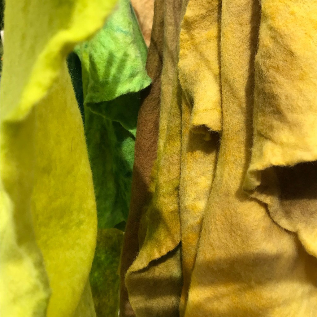 I love wet-felting. After all the years I’ve been doing it, and with a pretty sound understanding of managing the interaction between wool fibres, water, soap, temperature and friction, I still regard the moment when it all comes together as pure magic! At this scale it is hard work physically and I was glad to be in the studio with a moppable floor and my own deep sink. There is something very therapeutic, after all that rubbing and rolling, about gently rinsing the felt on a hot day!