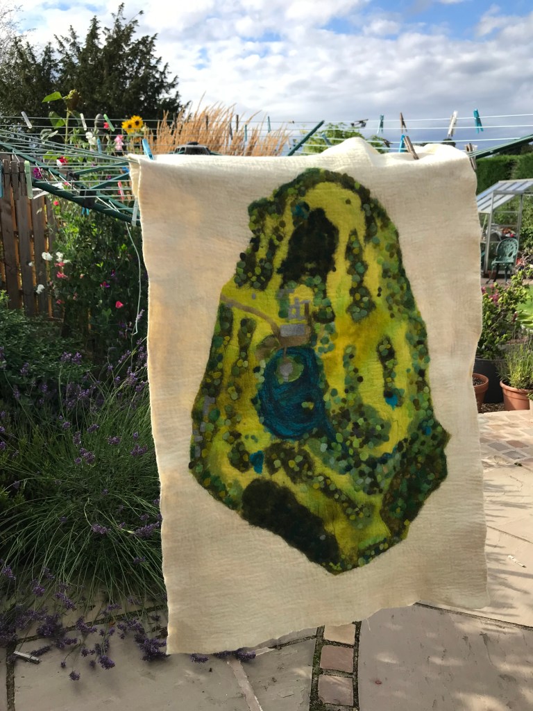 Once I had a thick, even background the fun started, creating the inside of the park, the golf course and hotel with mixed hand-dyed wools, prefelts and other fibres.