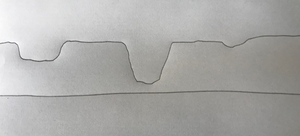 But eventually I began to identify the different stretches and see where the wall stands tall and where it no longer stands at all. On different lengths of paper I drew the contour of the top of the wall as I walked.