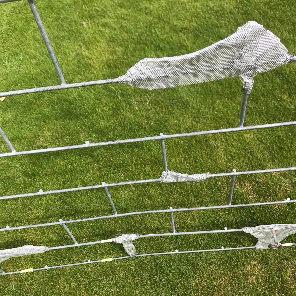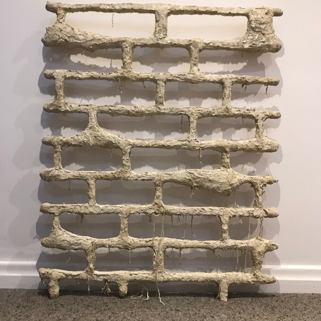The main problem with covering a metal frame with lime mortar is finding a way to ensure a bond between the two. Thinking this through I had the help of Simon Kershaw, architect, who is a member of the Friend’s of Waterton’s Wall group and hugely knowledgeable about stone and mortar and heritage building techniques. I had used a metal grid in a similar way with plaster in my 2019 exhibition so the solution we found for my wall was a development of what I had done then.