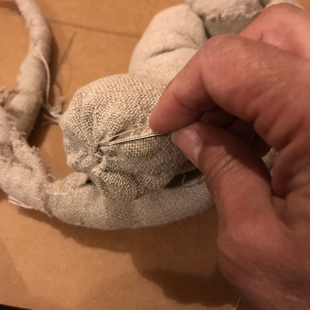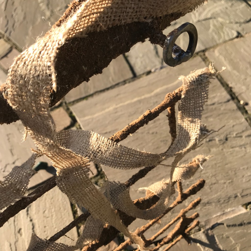 Following Simon’s advice, bit by bit, I coated a small section of the frame in a layer of mortar, then bound this tightly with hessian, then smeared another layer of mortar on the top pressing it into the weave of the hessian. Then I moved on to the next section.
