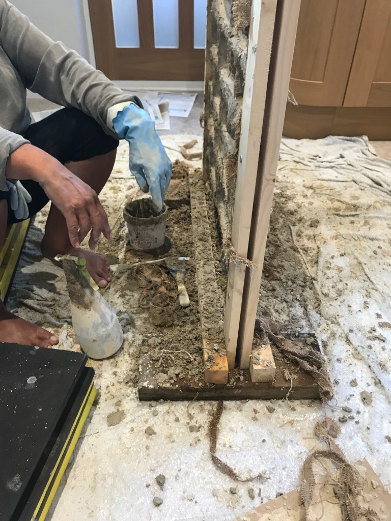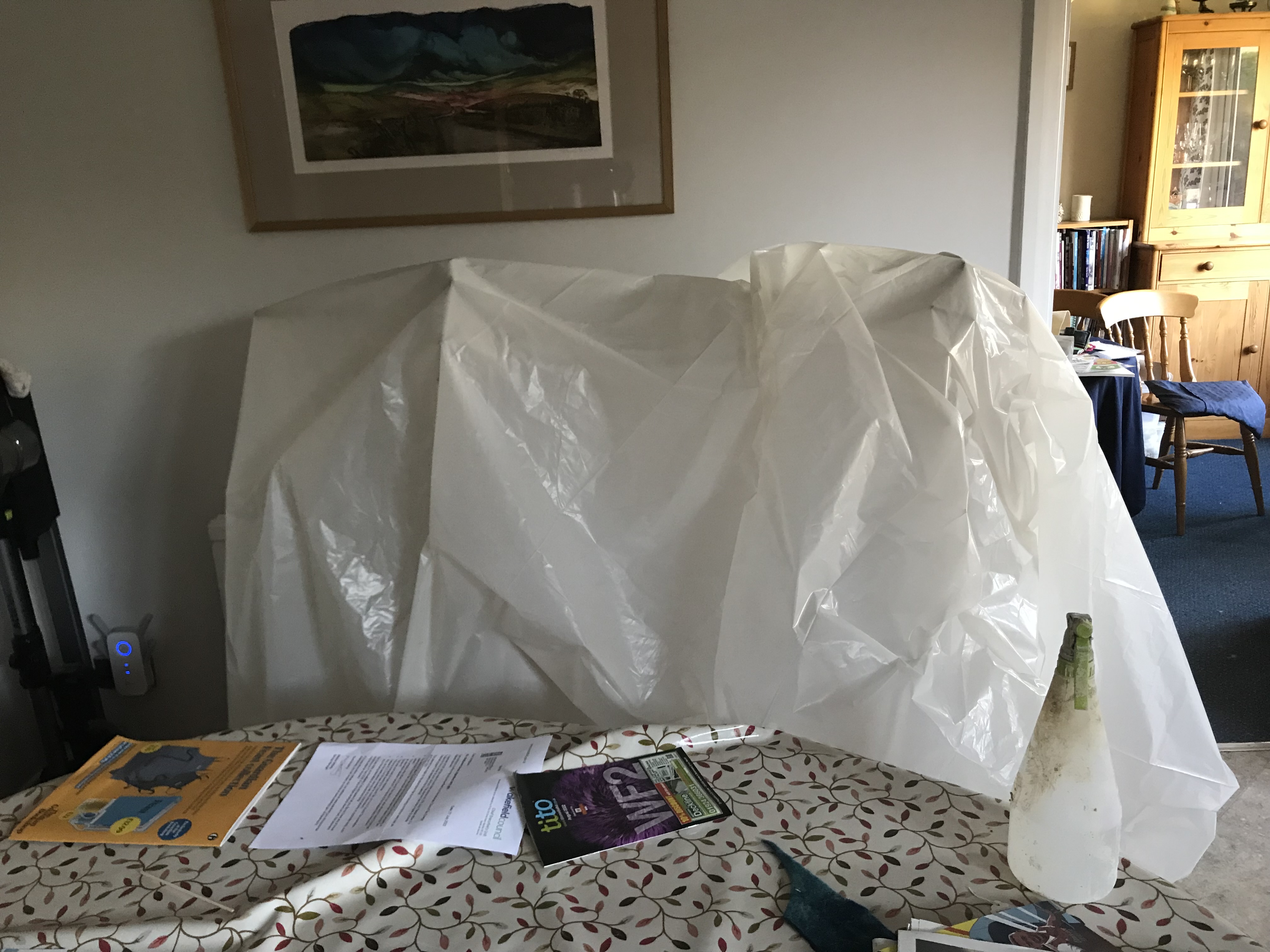 Mortar has to be kept damp for 4-5 days once it has been applied in order to enable curing to take place. So it remained in the kitchen, draped in a tarpaulin which allowed in air but kept things moist and 4 or 5 times a day I sprayed it with water. It felt a little like having a new baby who needed frequent attention! We got used to moving carefully around it.