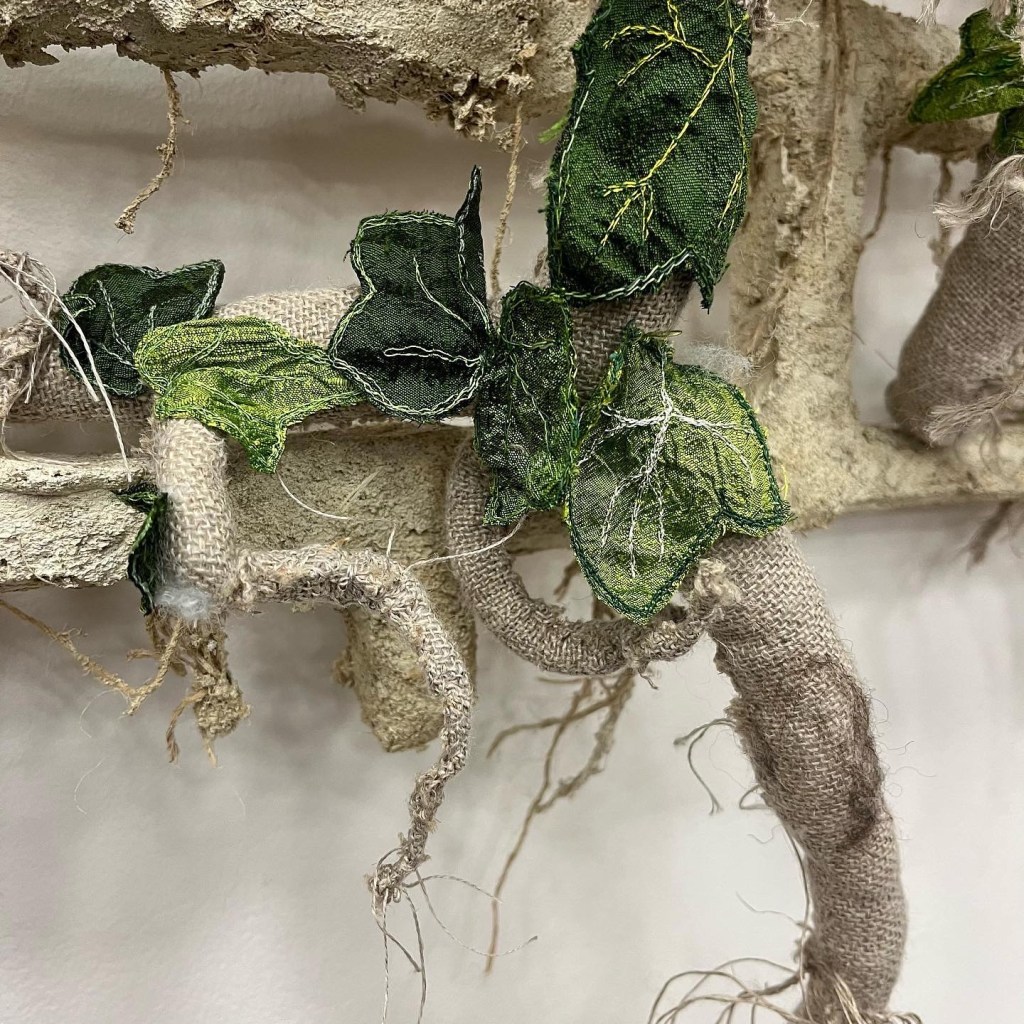 Using linen thread which was a perfect colour match enabled me to free-form the stems and laterals, creating a pile of elements without heed to an overall plan, and then stitching them together to form the shape I wanted.