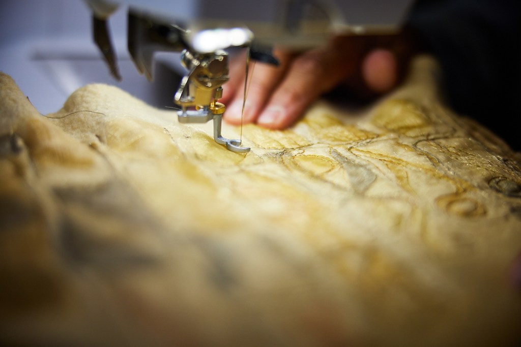 The key to FME is not an expensive machine, it’s just a question of preventing the teeth of the feed dog from touching the underneath of the fabric. The purpose of the teeth is to move the fabric forward in a straight line while the needle goes up and down. Once they are disengaged the fabric doesn’t get pushed along, unless it is moved by the person sewing. I always think it’s like inverse drawing. Instead of a moving pencil on static paper, you have a static pencil and move the paper under it. It seems difficult at first and calls for good hand eye co-ordination but like most things, what it really needs is practice – hours and hours of it and maybe a relaxed attitude to perfection! This bit of footage was filmed at Leeds Industrial Museum where I had an exhibition in 2019. I remember seeing this clip for the first time and getting an out-of-body type realisation of how my hands make this happen!
