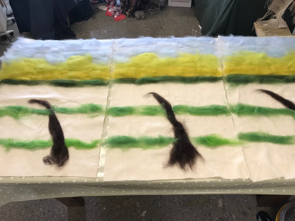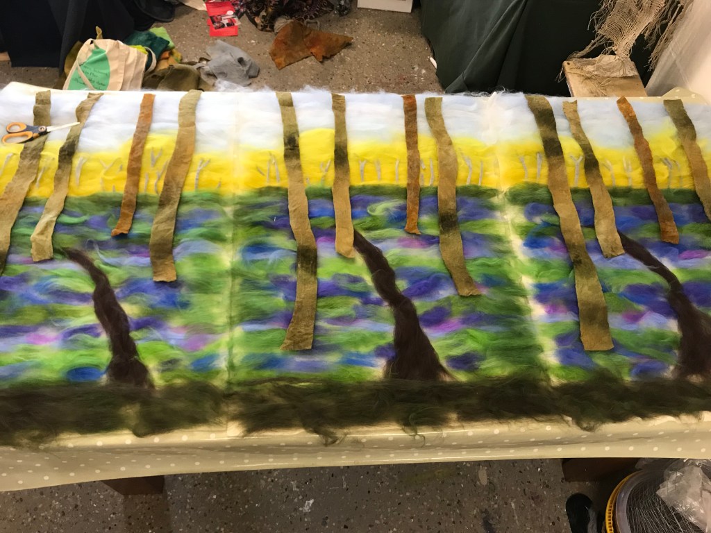 I started with the background. Three large woodland panels. To ensure similarity, I laid out designs for all 3 panels side by side and felted them simultaneously.