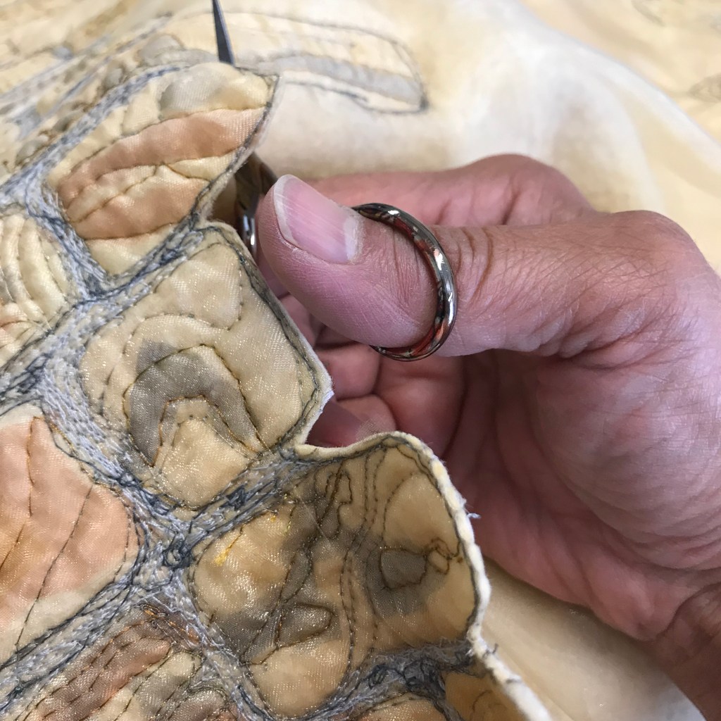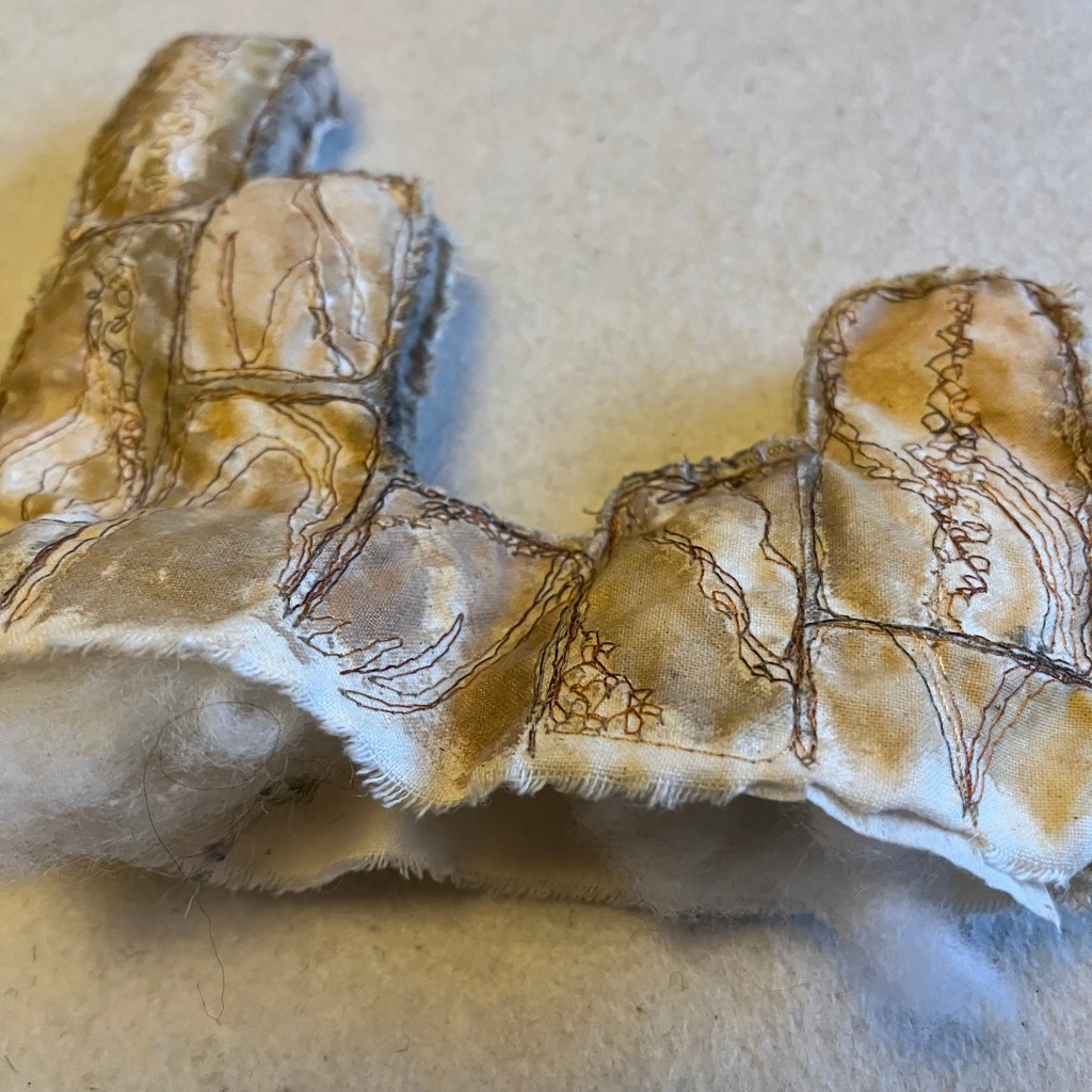 I wasn’t sure how to create the wall layer. My initial idea was to produce a calico wall with painted stones and to stitch it together like a mattress. The resulting sample lacked the glint of the sandstone, so the next thought was to use organza and stitch.