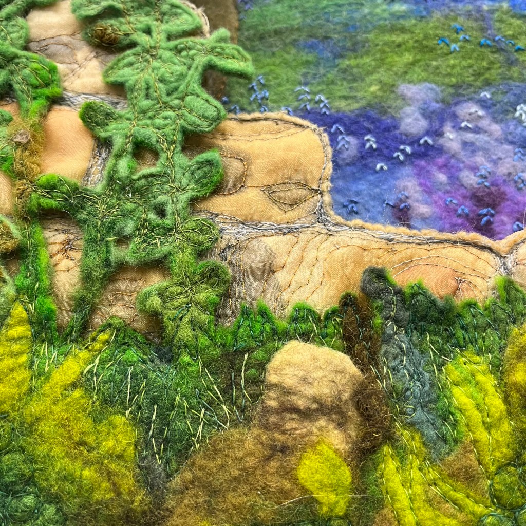The format for these three pieces is the same. A felted background of the wood at bluebell time. The foreground too, offers continuity—the wild undergrowth which grows and dies back each year. It is the mid-ground which changes. The wall, in decline from year to year. What would the fourth picture show?