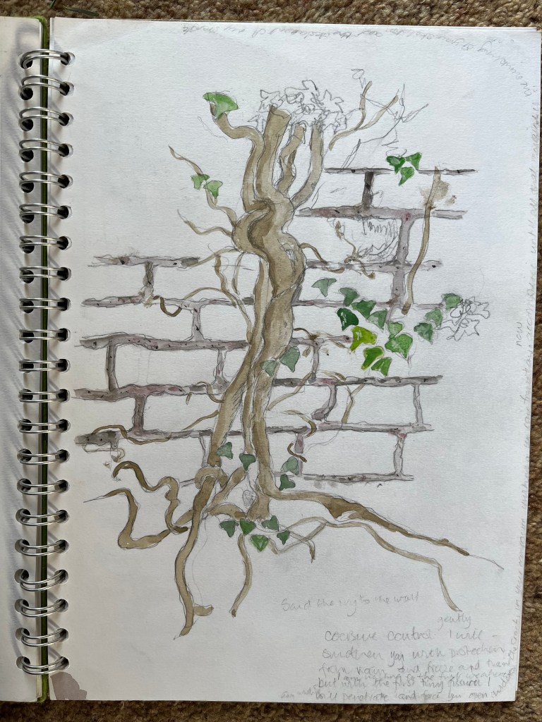 On the section of wall on which this piece is based there are a couple of large ivy stems which are prominent partly because the growth appears to have been cut back and the wall is exposed. The stems are intertwined, branching at the top and at the roots, into lateral growth bearing both leaves and a fringe of aerial roots.