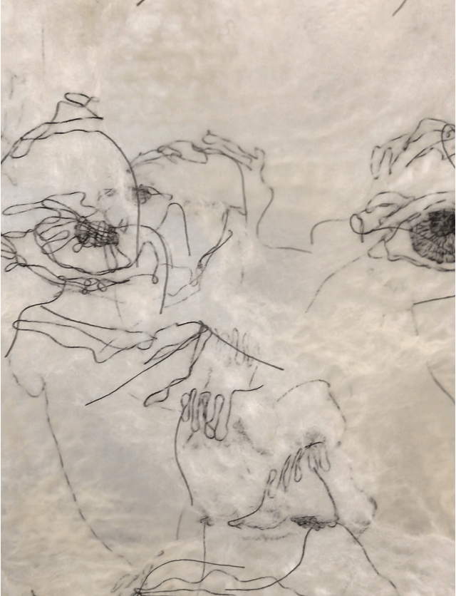 Cotton quilt with hand stitch, free motion embroidery and ink