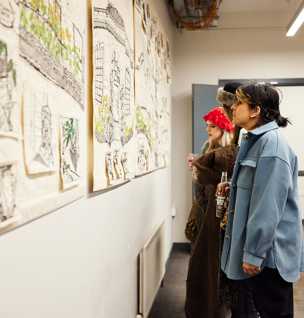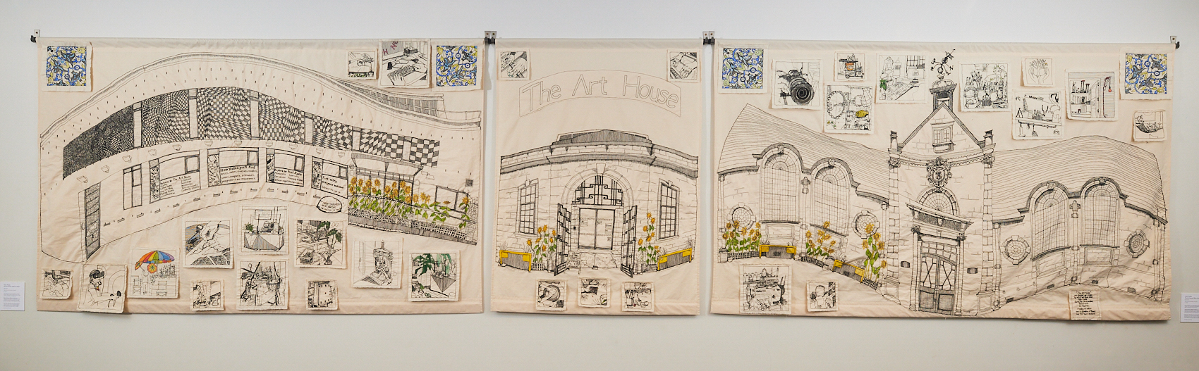 The Art House: 10km of stitch was designed and stitched during 2020/2021 when the Covid pandemic restricted activities and gave a new elasticity to time. The work celebrates not only the detail of this quirky and much-loved building but also the community of artists, designers and makers and all who work within its walls.