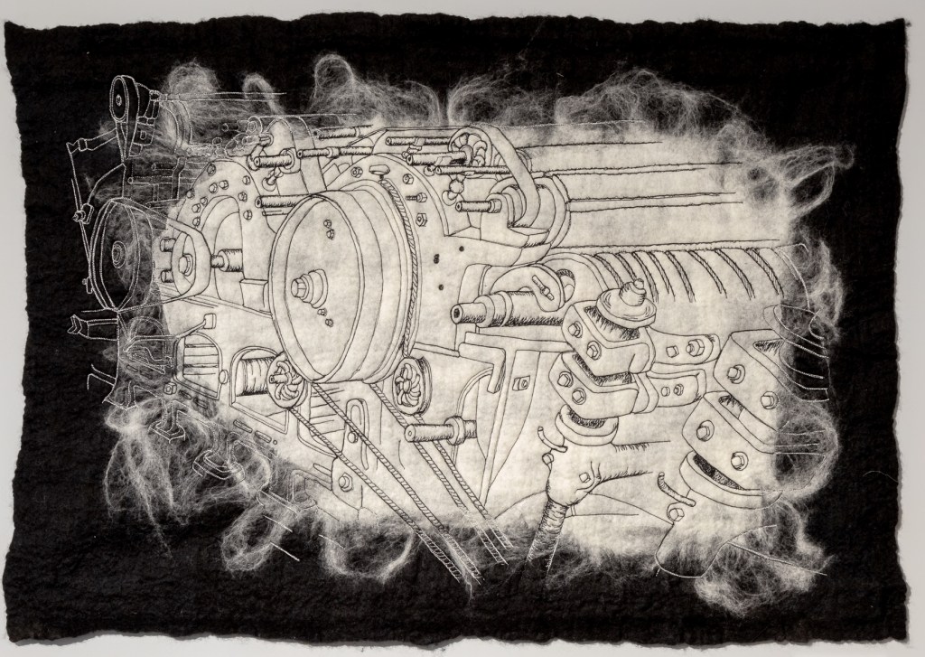 Carding Engine was inspired by the massive carding engine at Leeds Industrial Museum which was used to comb woollen fleece in preparation for spinning. The piece explores the sets of toothed rollers through a stitched line drawing in black and silver thread on a background of white silk and black wool. Whisps of white wool invoke the process and belie the heavy, relentless mechanism, one of the most dangerous in the textile industry.